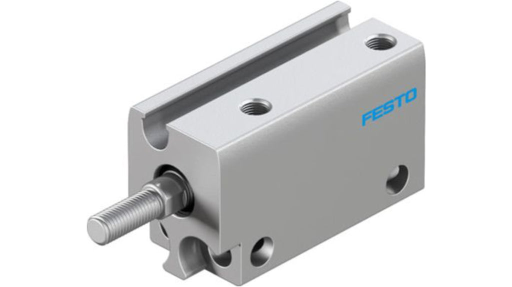 Cilindro pneumatico compatto a doppio effetto Festo. Foro da 6mm, corsa 10mm, rilevamento della posizione, filettatura esterna dello stelo del pistone. Collegamento pneumatico M3 con filettatura maschio. Temperatura ambiente da -10 a 60 gradi Celsius. Materiale in lega di alluminio lavorato. Peso 15 g. Modello ADN-S-6-10-A-A.