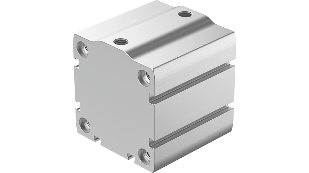 Cilindro pneumatico compatto Festo, serie ADN-S, azione a doppio effetto, corsa 50 mm, foro 63 mm, attacco G 1/8, pressione operativa massima 10 bar, temperatura operativa da 0 a 80 gradi, ammortizzazione elastica, costruzione in alluminio anodizzato e acciaio inox, conforme agli standard VDMA 24364. Peso 151 g, filettatura femmina sullo stelo del pistone.