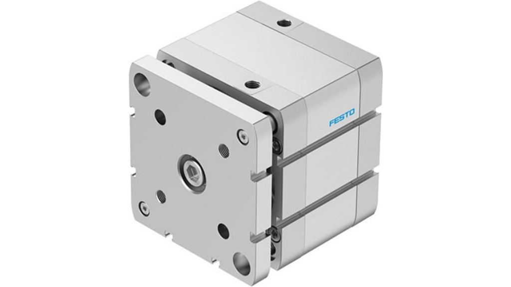 Cilindro pneumatico compatto, doppio effetto, foro 100mm, corsa 25mm, conforme allo standard ISO 21287, rilevamento posizione con interruttori di prossimità, ammortizzazione pneumatica autoregolante, design con pistone, stelo e canna profilata, classe 2 di resistenza alla corrosione, conforme a RoHS, funzionamento lubrificato, conformità VDMA24364 B1B2 L LABS. Codice costruttore ADNGF-100-25-PPS-A, marchio Festo.