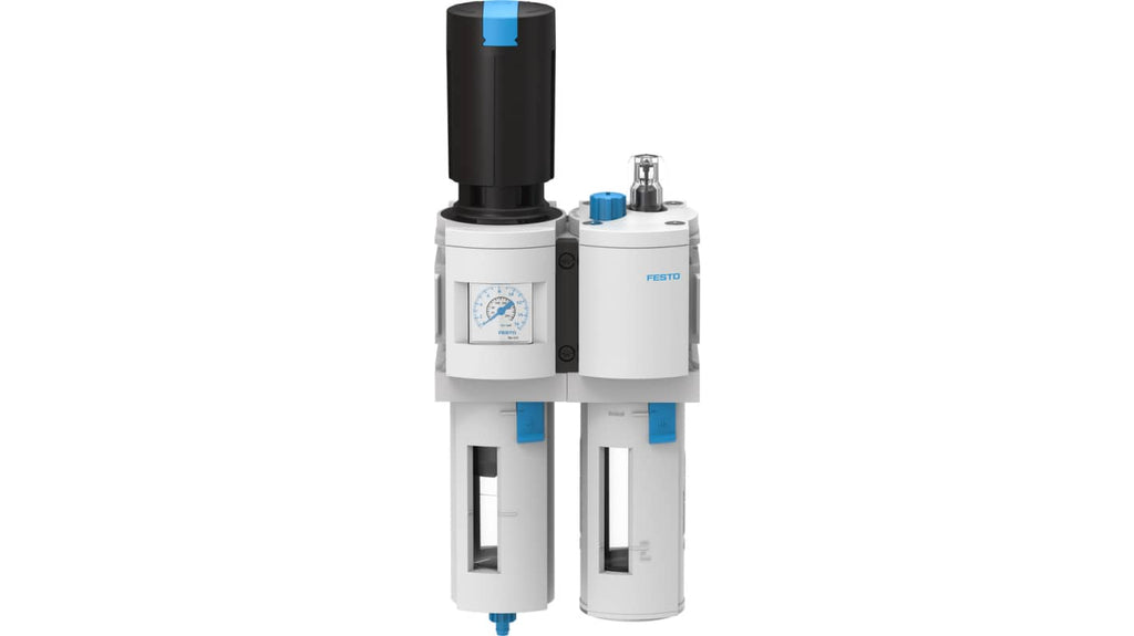 Gruppo FRL Festo per la preparazione dell'aria compressa, attacco G 1/2, scarico manuale, filtrazione 40 μm, pressione operativa da 1,5 bar a 20 bar, manometro integrato, dimensioni di filettatura 1/2 poll., gamma di taratura pressione da 0,03 a 0,7 MPa, design compatto, temperatura ambiente da -10 a 60 gradi Celsius, montaggio verticale con blocco integrato.