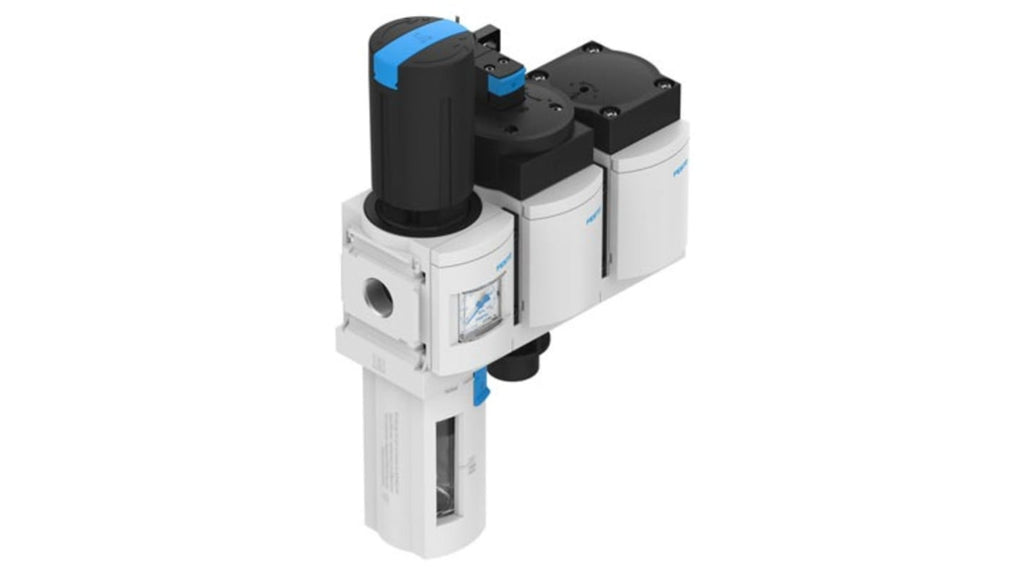Gruppo FRL Festo con attacco G 1/2, scarico manuale, filtrazione 40μm, manometro di pressione integrato. Progettato per montaggio verticale con tolleranza di 5 gradi. Classe di resistenza alla corrosione CRC 2, conforme a VDMA24364-B1/B2-L. Temperatura di stoccaggio da -10 a 60 gradi. Serie del produttore MSB6.