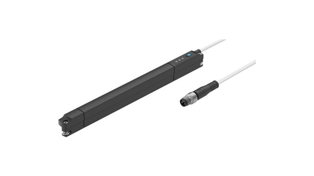 Sensore per cilindro pneumatico, trasmettitore di posizione Festo, principio magnetico di Hall, tensione di alimentazione 15-30V cc, intervallo di temperatura -25 a 70 gradi Celsius, intervallo di campionamento 1 ms, velocità massima di spostamento 3 m/s, protezione IP65 e IP68, operazione manuale, indicatore LED, conformità RoHS, senza alogeni. Modello SDAT-MHS-M160-1L-SV-E-0.3-M8.