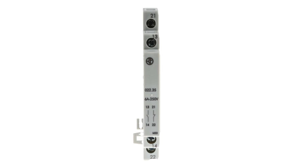 Contatto ausiliario per guida DIN, 1 contatto, 1 N/C + 1 N/A, serie 22. Corrente nominale contatto 6 A, tensione nominale contatto 230 V c.a., montaggio su guida DIN, tipo terminale a vite, configurazione DPST. Bobina silenziosa ca/cc con protezione varistore, separazione protettiva tra bobina e contatti, indicatori meccanici e LED standard.
