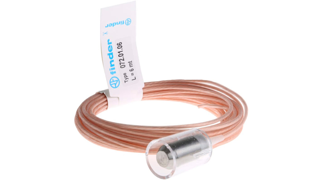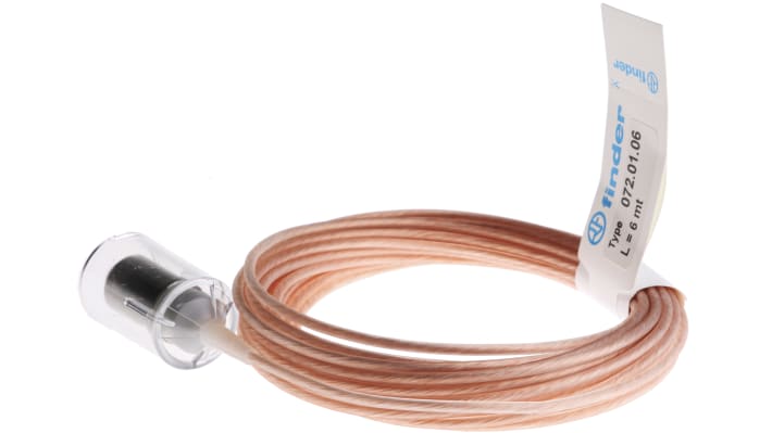Relè di monitoraggio per liquidi conduttivi, Finder serie 72, montaggio verticale su guida DIN, uscita relè, gamma di sensibilità regolabile da 5 a 150 kΩ, interruttore con tempo di ritardo selezionabile (0,5s o 7s), funzioni di riempimento o svuotamento, lunghezza cavo 6m, temperatura operativa da 0 a 100 gradi Celsius. Codice costruttore 072.01.06.