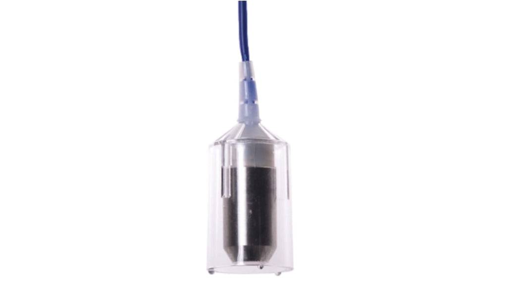 Relè di monitoraggio per liquidi conduttivi, Finder serie 72, montaggio verticale su guida DIN, uscita relè, gamma di sensibilità regolabile da 5 a 150 kΩ, interruttore con tempo di ritardo selezionabile (0,5s o 7s), funzioni di riempimento o svuotamento, corpo in acciaio inox, lunghezza cavo 6m, temperatura operativa da 0 a 100 gradi Celsius.