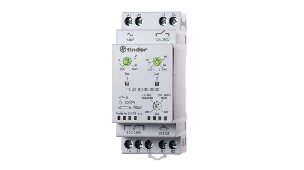 Pulsante temporizzatore con relè fotosensibile, tensione di alimentazione 230 V ca, configurazione contatto SPDT, 2 canali. Selettore a 4 posizioni: luce Off, luce On, soglia standard 1-80 lux, soglia elevata 20-1000 lux. Indicazione di stato a LED. Fornito con sensore fotoelettrico e adattatore per montaggio a pannello. Tipo terminale a vite. Adatto per installazioni professionali.