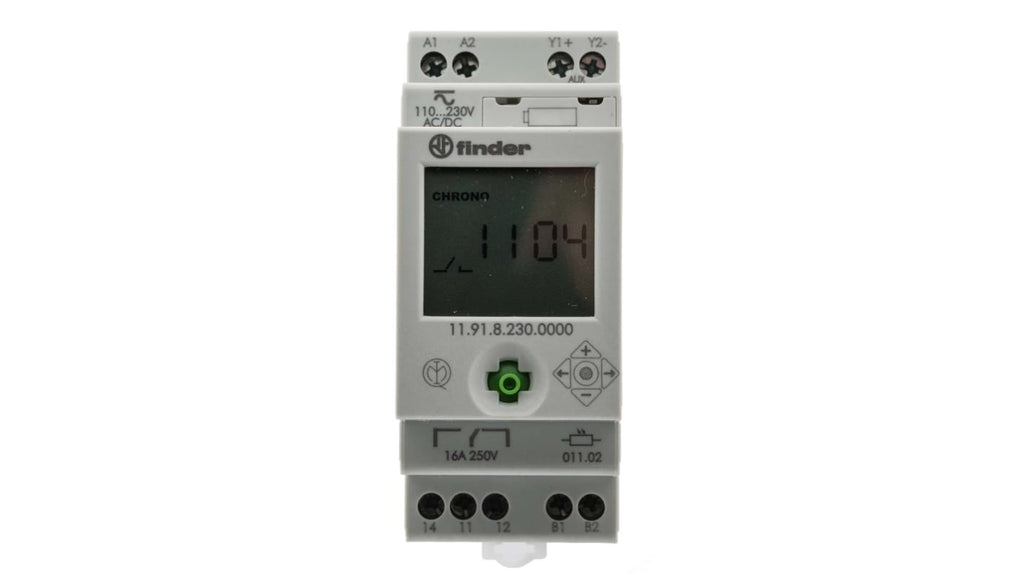 Pulsante temporizzatore con relè fotosensibile, 230 V ca, 1 canale, configurazione contatto SPDT + uscita ausiliaria, gestione diretta tramite fotosensore, batteria interna per backup programmazione, dimensioni 60.8 mm x 35 mm, durata batteria 5 anni, tipo terminale a vite. Brevetto in sospeso per compensazione feedback luminoso per evitare oscillazioni delle lampade.