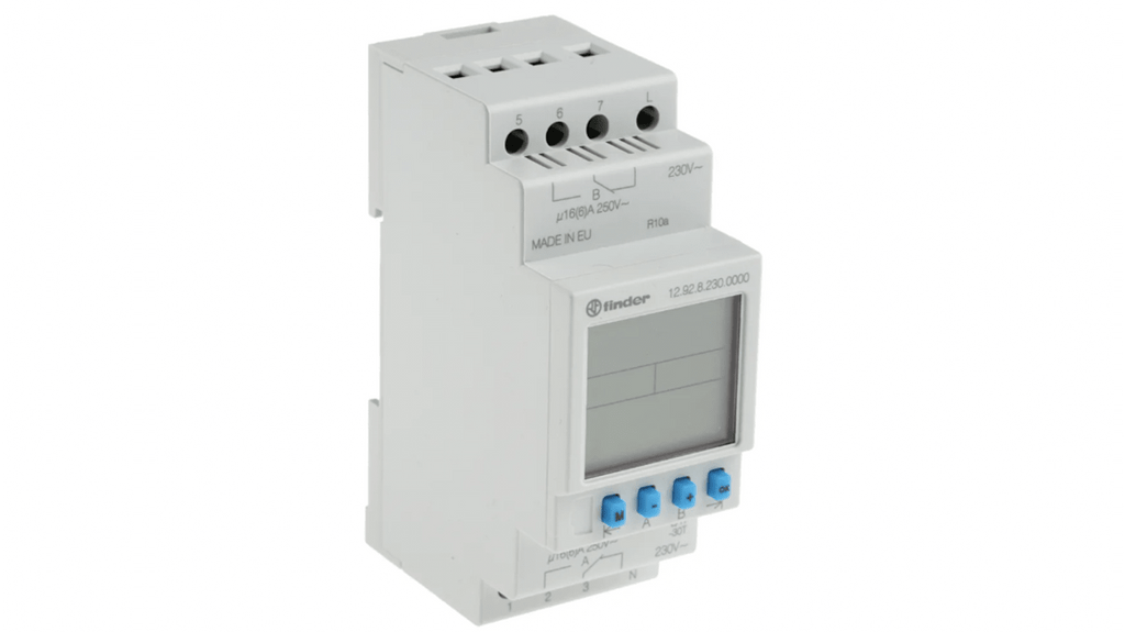 Temporizzatore digitale programmabile per guida DIN, 230 V ca, 2 canali, DPDT, intervallo di programmazione minimo 1 minuto, funzione "Astro" con coordinate geografiche preregistrate, programmazione senza alimentazione, passaggio automatico ora legale/solare, contatti di commutazione a secco 2 x 16 A, larghezza 35,8 mm, montaggio su guida DIN 35 mm, indice di protezione IP20, conforme a standard EN 50022, EC. Dimensioni: 90 mm x 60 mm.