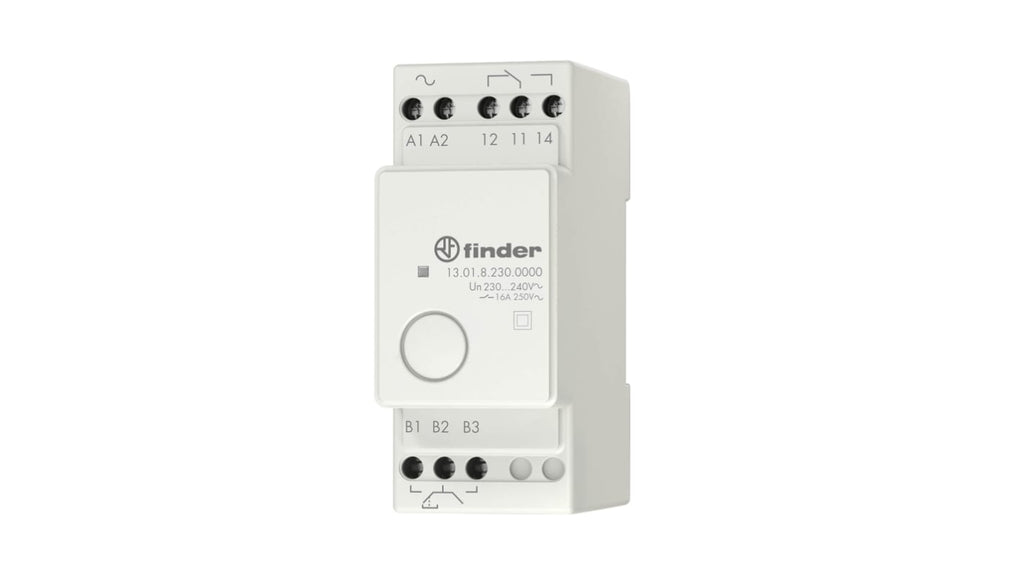 Relè di potenza Finder serie 13, SPDT, bobina 230V ca, montaggio su guida DIN. Corrente di commutazione 16A, tensione di commutazione massima 400V ca, potenza di commutazione massima 4 kVA. Isolamento bobina-contatto 4kV ac, vita 100000 cicli elettrici. Range di temperatura operativa -10°C a +60°C. Materiale contatto in lega di argento. Dimensioni 35mm x 54.6mm x 84mm. Applicazione SELV, conforme a IEC 364.