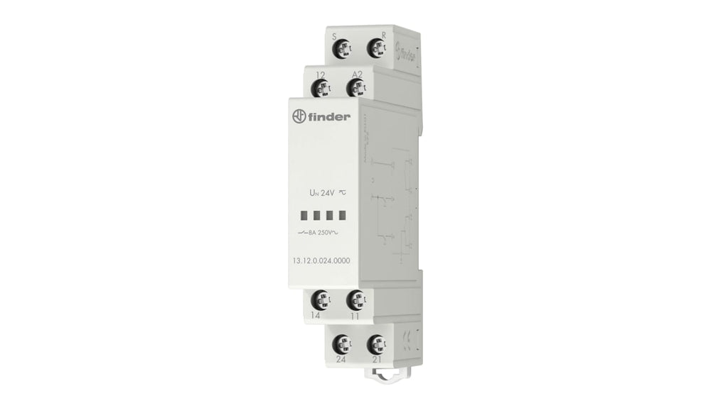 Relè di potenza Finder serie 13, SPDT, bobina 12V ca/cc, montaggio su guida DIN. Corrente di commutazione 8A, potenza di commutazione massima 2 kVA, tensione di commutazione massima 400V ca. Dimensioni 17,5 mm di larghezza, 88,8 mm di altezza, 60,8 mm di profondità. Temperatura operativa da -10 a +60 gradi Celsius, grado di protezione IP 20, vita elettrica 100000 cicli. Materiale contatto in lega di argento.