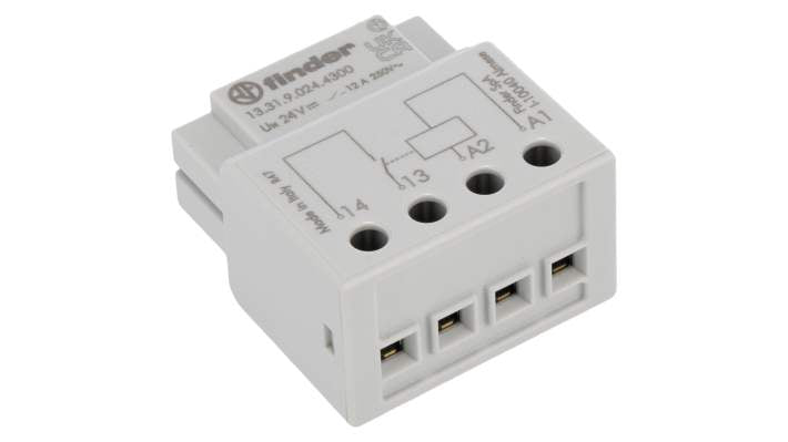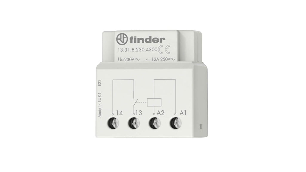 Relè monostabile di interposizione Finder serie 13.31, bobina 24V cc, configurazione contatto SPST, corrente di commutazione 12A, tensione di commutazione massima 400V ca, potenza di commutazione massima 3 kVA, materiale contatto lega di argento, montaggio in scatola interruttori, dimensioni 37mm x 39mm x 22.7mm, vita utile 70000 cicli elettrici, temperatura operativa da -10°C a +60°C, isolamento bobina-contatto 2kV.