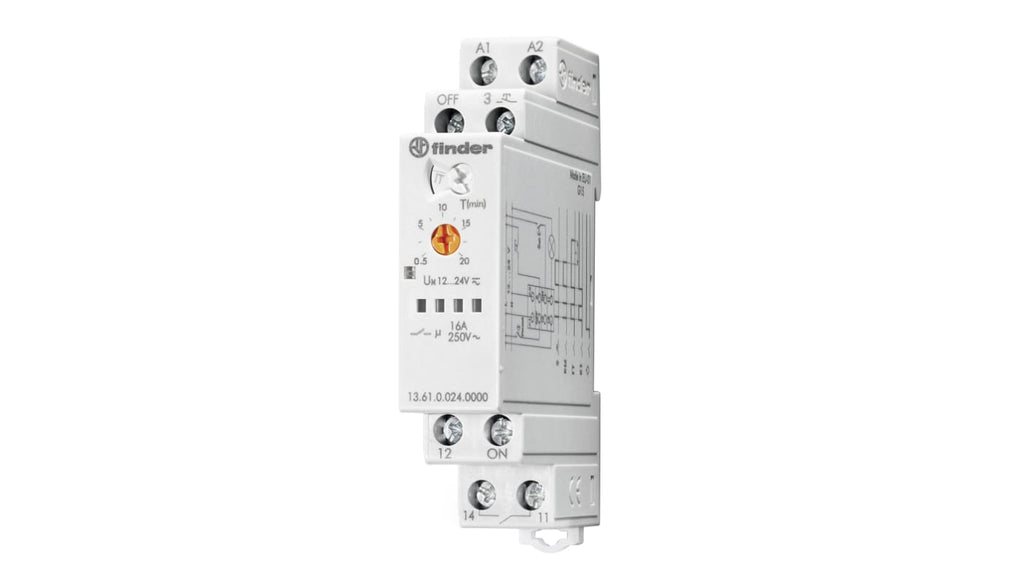Relè di potenza Finder serie 13, SPST, bobina 230V ca, montaggio su guida DIN. Multifunzione con comando di reset, corrente di commutazione 16A, potenza di commutazione massima 4 kVA, tensione di commutazione massima 400V ca. Dimensioni 17.5mm x 60.8mm x 88.8mm, vita elettrica 100000 cicli, materiale contatto lega di argento, isolamento bobina-contatto 2kV, temperatura operativa da -10°C a +60°C. Morsetto a vite.