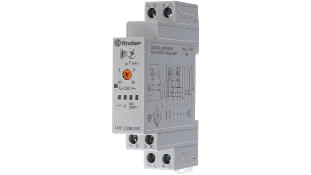 Temporizzatore luce scala modulare Finder, teleruttore multifunzione, tensione di alimentazione 230 V ca, configurazione contatto unipolare normalmente aperto, intervallo di temporizzazione da 30s a 20mn, visualizzazione stato con LED verde e rosso, regolazione tramite pulsante e cacciavite, fissaggio su rotaia DIN, dimensioni 88.8mm x 63.8mm. Codice costruttore 14.01.8.230.0000.