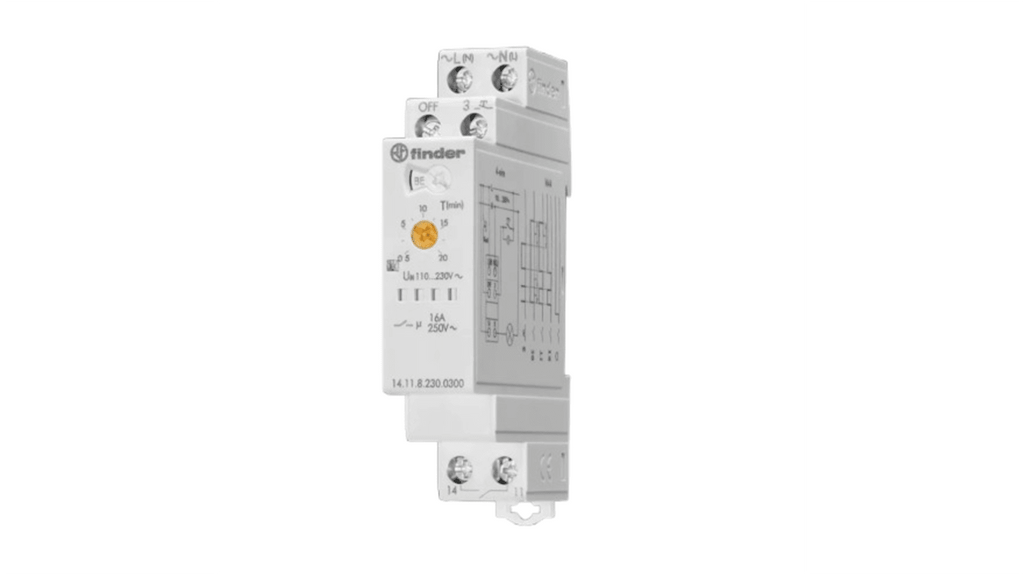 Temporizzatore luce scala elettronico, 230 V c.a., 1 canale, 16 A, larghezza 17,5 mm, 4 funzioni, terminale per reset. Tipo digitale, unità misurate in minuti. Progettato per il controllo dell'illuminazione in scale, corridoi e atri, con spegnimento automatico delle luci. Codice costruttore 14.11.8.230.0300, marchio Finder.