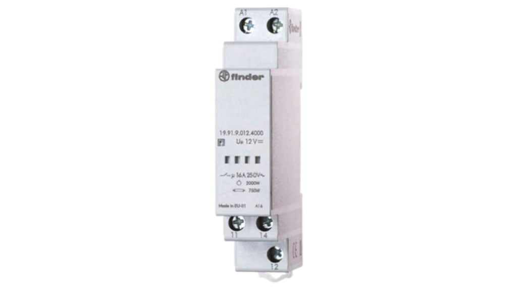 Modulo relè per guida DIN, bobina 12V cc, contatti SPDT, potenza 16A, adatto per carichi di luci incandescenti fino a 2000 W e fluorescenti compensate fino a 750 W. Contatti in lega di argento, indicazione LED, dimensioni 88.8 x 17.5 x 60.8 mm, temperatura operativa da -20 a +50 gradi Celsius, tempo di attivazione 12 ms, tempo di spegnimento 8 ms. Codice costruttore 19.91.9.012.4000.