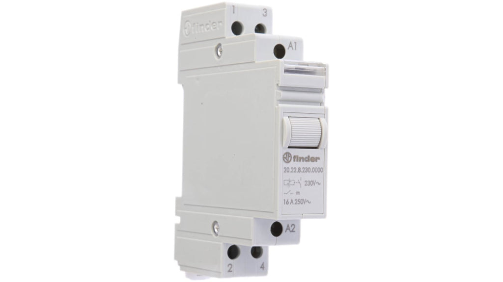 Relè di potenza Finder serie 20, DPST, bobina 230V ca, montaggio su guida DIN. Corrente di commutazione 16A, tensione di commutazione massima 250V ca, potenza di commutazione massima 4 kVA. Isolamento bobina-contatto 4kV, temperatura operativa da -40 a +40 gradi Celsius. Materiale contatto in lega d'argento, terminazione a vite, pulsante di prova con indicatori meccanici. Dimensioni 17,4mm x 84mm x 58,4mm, grado di protezione IP20. Certificazioni CE, CRUus, EAC, LROS, RINA.