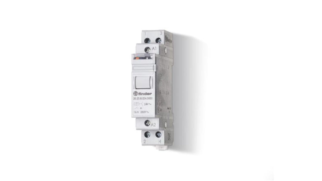 Relè di potenza Finder, bobina 24V cc, montaggio su guida DIN. Corrente di commutazione 16A, interruttore bifase 1 NA + 1 NC, larghezza un modulo 17,4 mm. Pulsante di test e indicatore meccanico, 7 sequenze, contatti senza cadmio. Collegamento con pulsanti illuminati tramite adattatore tipo 026.00 Finder. Conforme alla norma EN 60715. Codice costruttore 20.23.9.024.4000.