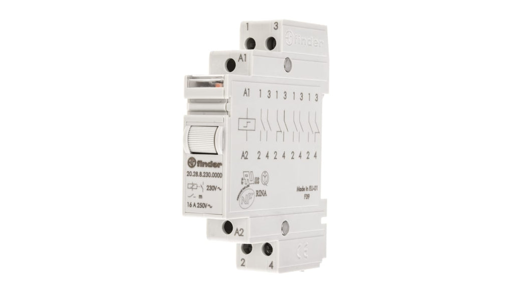 Relè di potenza Finder serie 20, DPST, bobina 230V ca, montaggio su guida DIN. Corrente di commutazione 16 A, potenza di commutazione massima CA 4 kVA. Resistenza bobina 2,5 kΩ, durata minima impulso 0,1 sec, massima impulso 1 ora. Gamma di temperatura -40 a +40 gradi Celsius, grado di protezione IP20. Materiale contatto in lega di argento, autorizzato UL per Canada e Stati Uniti. Dimensioni 58,4 mm di profondità, larghezza 17,5 mm.