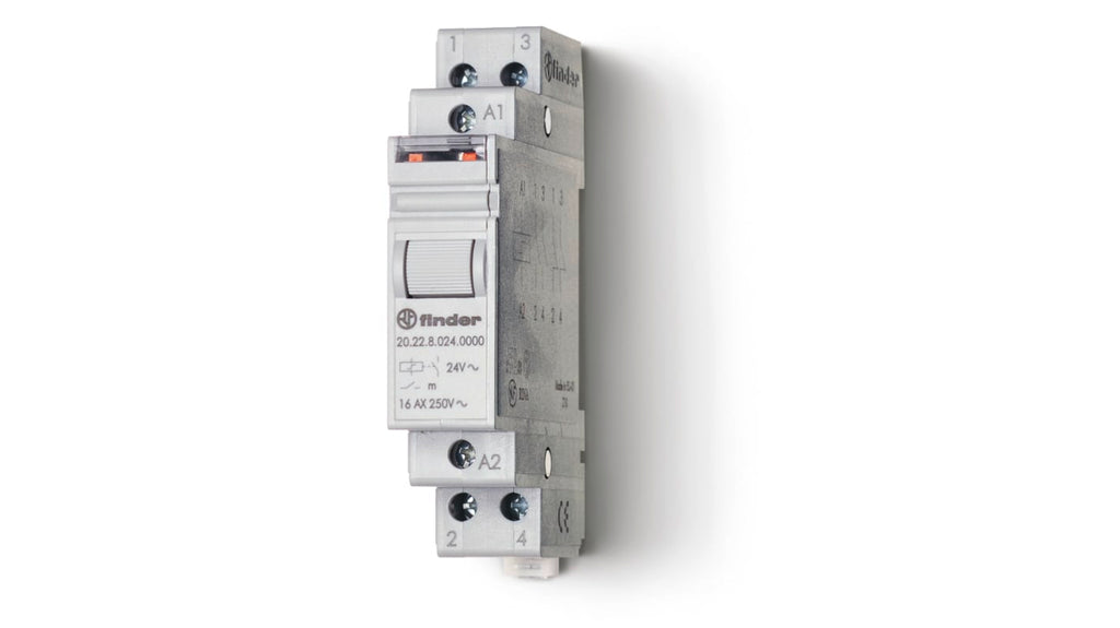 Relè di potenza Finder, bobina 12V cc, montaggio su guida DIN. Corrente di commutazione 16 A, interruttore bifase, larghezza 17,4 mm. Pulsante di prova con indicatori meccanici, 7 sequenze di commutazione, conforme a EN 60601-1, 2 MOPP. Materiale del contatto senza cadmio, possibilità di collegare pulsanti illuminati con parte aggiuntiva.