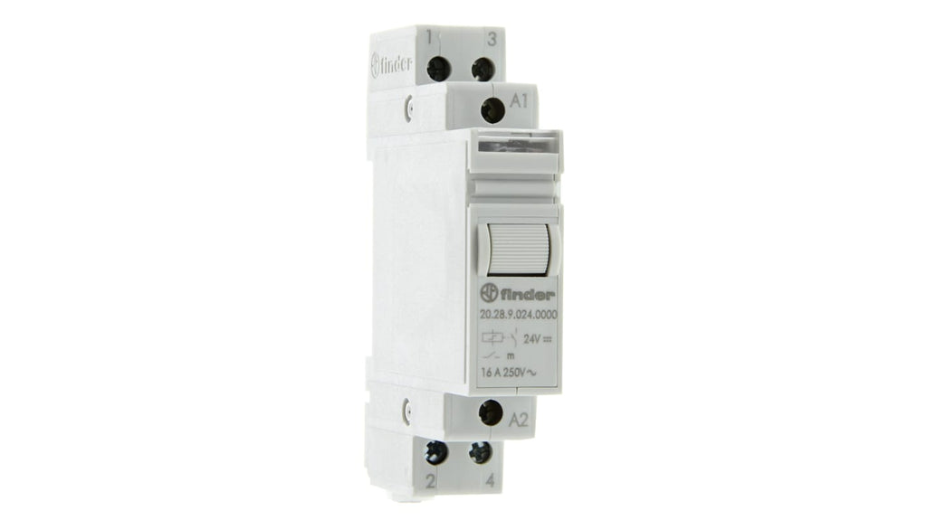 Relè di potenza Finder serie 20, DPST, bobina 24V cc, montaggio su guida DIN. Corrente di commutazione 16 A, potenza di commutazione massima CA 4 kVA. Resistenza bobina 105 Ω, durata minima impulso 0,1 sec, massima impulso 1 ora. Gamma di temperatura -40 a +40 gradi Celsius, grado di protezione IP20. Materiale contatto in lega di argento, profondità 58,4 mm. Autorizzatori UL per Canada e Stati Uniti.
