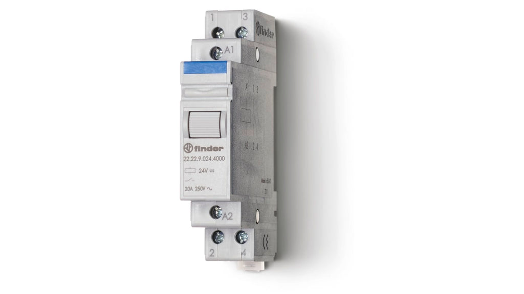 Relè monostabile modulare per guida DIN. Tensione bobina 12V ca, corrente di commutazione 20A, interruttore bifase 2 NA (DPST-NO), resistenza bobina 115 Ω, potenza bobina 1.25W. Dimensioni 17,4 mm di larghezza, montaggio su guida 35 mm (EN 60715), materiale del contatto senza cadmio, dotato di pulsante di test e etichetta di identificazione. Codice costruttore 22.22.8.012.4000. Marchio Finder.