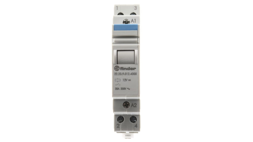 Relè di potenza Finder serie 22, SPST-NC, SPST-NO, bobina 12V cc, montaggio su guida DIN, corrente di commutazione 20A, contatti senza cadmio, tensione massima 250V ca, potenza di commutazione massima 5 kVA, resistenza bobina 115 ohm, potenza bobina 1,25 W, isolamento bobina-contatti 4 kV, temperatura operativa -40 °C a +40 °C, dimensioni 17,4 mm x 58,4 mm x 84 mm, grado di protezione IP20, certificazione CE, GOST, conforme a EN 60715.