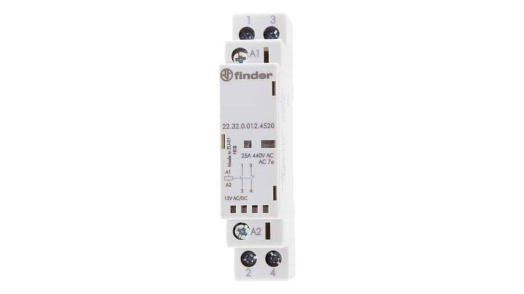 Contattore modulare 25 A, serie 22 Finder, 2 poli, configurazione 1 NO + 1 NC, bobina 12 V c.c. senza distanza tra i contatti, doppio contatto, impiego continuo, bobina silenziosa con protezione varistore, separazione protettiva tra bobina e contatti, indicatori meccanici e LED standard. Dimensioni 84 mm x 17.5 mm x 60.8 mm, temperatura operativa da -20°C a +50°C. Codice costruttore 22.32.0.012.4520.