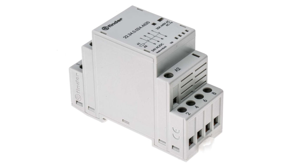 Contattore modulare 25 A, serie 22 Finder, 4 poli, configurazione 2 NO + 2 NC, tensione bobina 24 V c.a., potenza nominale 4 kW, tensione nominale contatto 250 V c.a. e 440 V ca, isolamento rinforzato, indicatori meccanici e LED, dimensioni 35 mm x 35 mm x 60.8 mm, temperatura operativa da -20 a +50 gradi Celsius, tipo terminale a vite. Codice costruttore 22.34.0.024.4620.