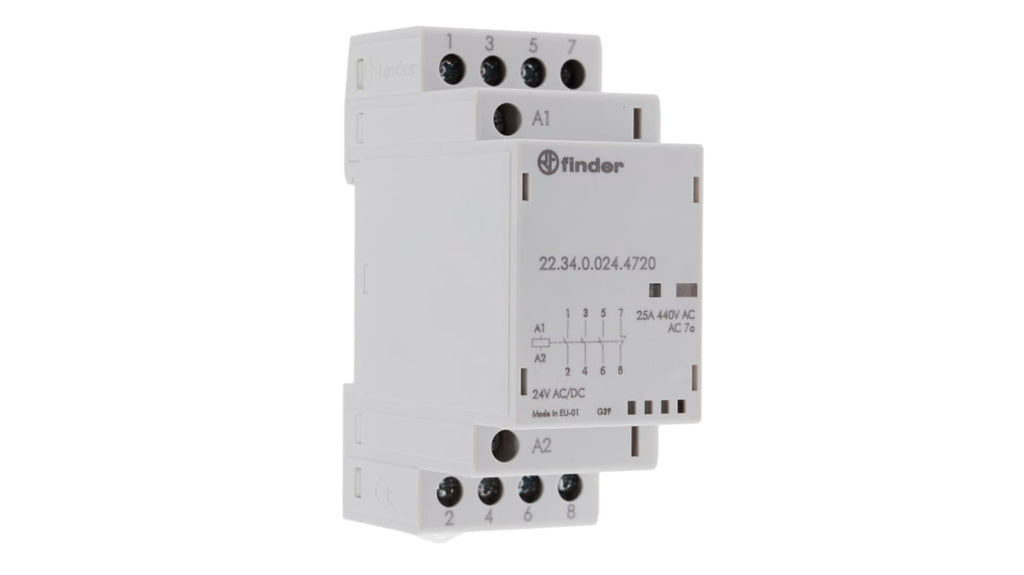 Contattore Finder, serie 22, 4 poli, corrente nominale 25 A, tensione bobina 24 V c.a./c.c., funzionamento continuo, bobina silenziosa con protezione varistore, indicatori meccanici e LED, separazione protettiva tra bobina e contatti, montaggio su guida DIN 35 mm, conformità a EN 6109: 2009, temperatura operativa da -20°C a +50°C. Codice costruttore 22.34.0.024.4720.