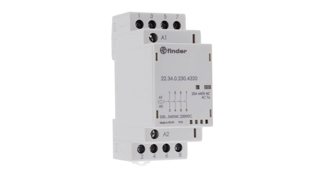 Contattore modulare per guida DIN, 4 poli, corrente nominale 25 A, tensione bobina 240 V CA, serie 22. Funzionamento continuo, bobina silenziosa con protezione varistore, indicatori meccanici e LED standard. Separazione protettiva tra bobina e contatti, conformità a EN 6109: 2009. Dimensioni: lunghezza 35 mm, profondità 60.8 mm, temperatura operativa da -20 a +50 gradi Celsius. Montaggio su guida di 35 mm.