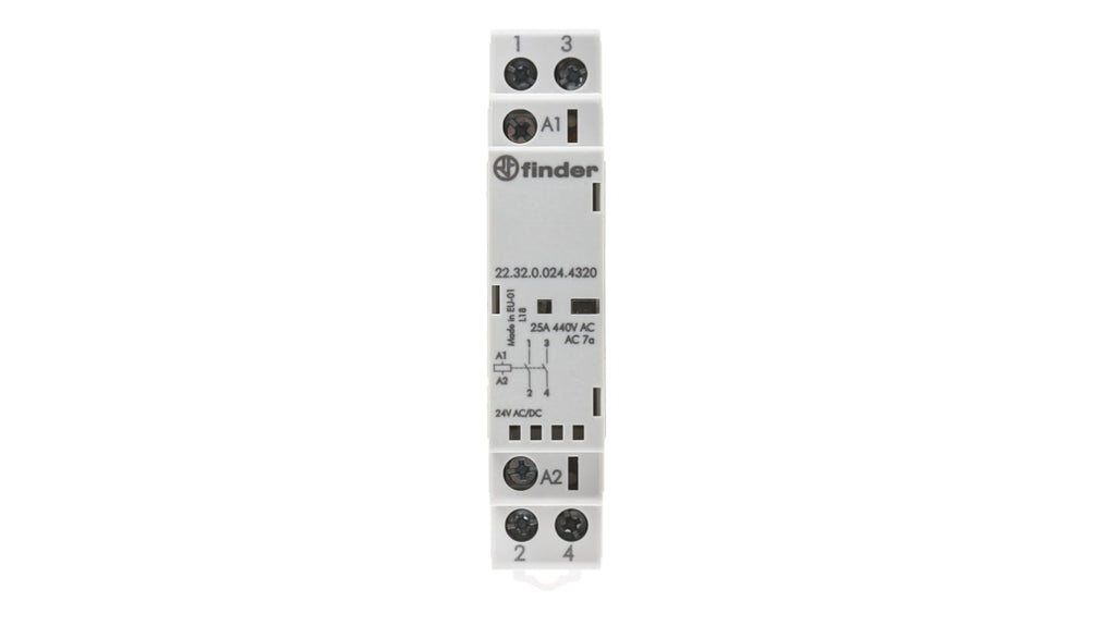 Contattore modulare da 25 A, 4 poli, tensione bobina 240 V CA, funzionamento continuo, bobina silenziosa con protezione varistore, indicatori meccanici e LED standard, separazione protettiva tra bobina e contatti, montaggio su guida DIN 35 mm, conformità a EN 6109: 2009, temperatura operativa da -20 a +50 gradi Celsius, tipo terminale a vite, dimensioni 35 mm di lunghezza e 60.8 mm di profondità.