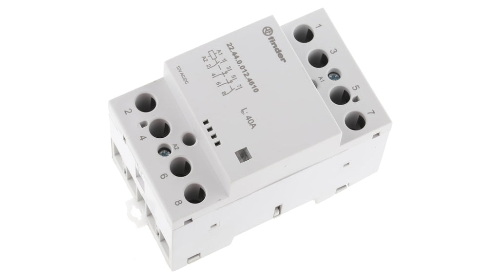 Contattore modulare a 4 poli, serie 22, corrente nominale 40 A, tensione bobina 12 V c.a./c.c., montaggio su guida DIN da 35 mm, morsetto a vite, separazione protettiva tra bobina e contatti, bobina silenziosa con protezione varistore, conforme a EN 61095:2009 ed EN 60947-4-1:2009, dimensioni 53.5 mm x 63.1 mm, temperatura operativa da -5°C a +55°C.