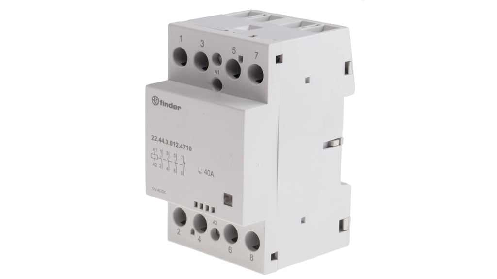 Contattore modulare a 4 poli, corrente nominale 40 A, tensione bobina 12 V c.a./c.c., montaggio su guida DIN da 35 mm, morsetto a vite, separazione protettiva tra bobina e contatti, bobina silenziosa con protezione varistore, conforme a EN 61095:2009 ed EN 60947-4-1:2009, dimensioni 53.5 mm x 63.1 mm, temperatura operativa da -5°C a +55°C.