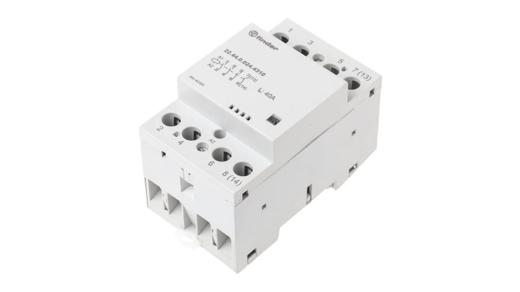 Contattore modulare a 4 poli, serie 22, corrente nominale 40 A, tensione bobina 24 V c.a./c.c., montaggio su guida DIN da 35 mm, morsetto a vite, lunghezza 53.5 mm, profondità 63.1 mm, temperatura operativa da -5°C a +55°C, conforme a EN 61095:2009 ed EN 60947-4-1:2009, bobina silenziosa con protezione varistore, separazione protettiva tra bobina e contatti.