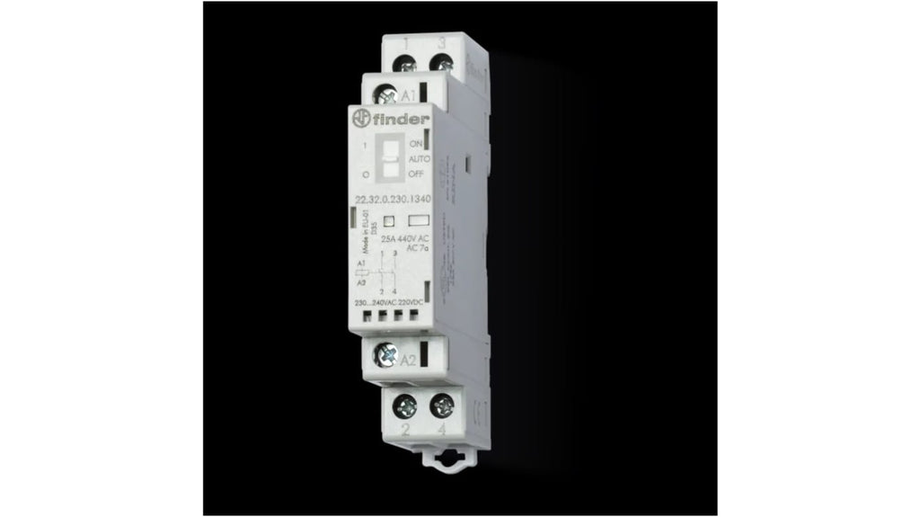 Contattore Finder, serie 22, 2 poli, relè DPNO monostabile, tensione bobina 24 VDC, corrente di commutazione 25 A, potenza 2,2 W, contatti 2 NA, isolamento rinforzato, indicatori meccanici e a LED, bobina silenziosa con protezione varistore, montaggio su guida DIN 35 mm, dimensioni 17,5 mm x 60,8 mm x 84 mm, conforme a EN 60715.