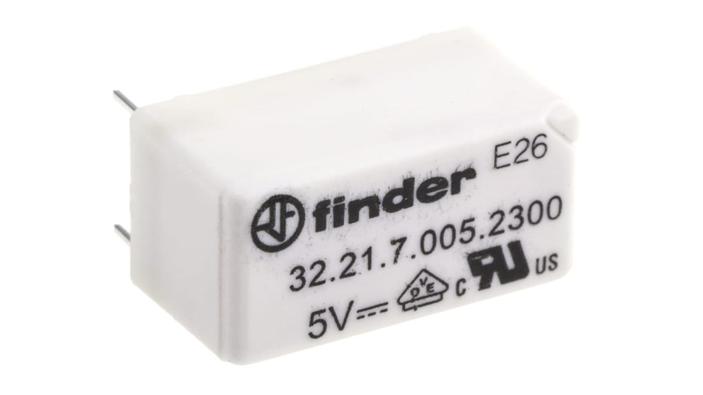 Relè di potenza Finder serie 32, SPST, bobina 5V cc, montaggio su circuito stampato, tensione nominale 250 V ca, corrente di commutazione 6 A, potenza di commutazione massima 1,5 kVA, isolamento bobina-contatto 5000 V c.a., temperatura operativa da -40 a +85°C, dimensioni 10,7 x 10,2 x 20,3 mm, materiale contatto lega di argento, autorizzato UL e VDE, vita 20000000 cicli elettrici e meccanici.