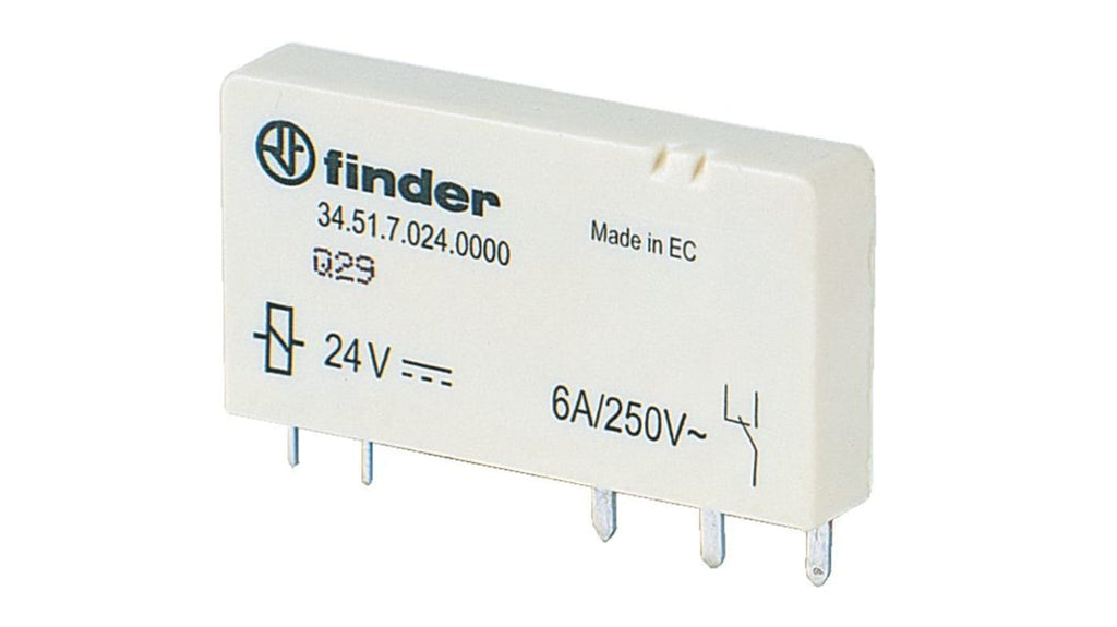 Relè di potenza PCB, configurazione unipolare SPDT, bobina 24V, corrente di commutazione 6A, resistenza bobina 3,35kOhm, separazione sicura secondo VDE 0160, traferro 6 mm, percorso di dispersione 8 mm, materiale contatto AgSnO2, ultra sottile 5 mm di larghezza, bobina CC sensibile, conforme a RoHS, montaggio su circuito stampato.