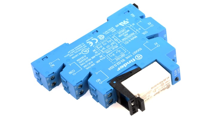 Modulo relè d'interfaccia per guida DIN, bobina 24V ca/cc, contatti DPDT 2, tensione di switching 250-400V, corrente di commutazione 8A, isolamento elettrico completo, espulsione immediata tramite clip in plastica, indicatore bobina integrato, temperatura di esercizio da -40 a +70 gradi Celsius, dimensioni 89.7 x 14 x 77.1 mm, grado di protezione IP20, certificazioni CE, CSA, EAC, CRUus.