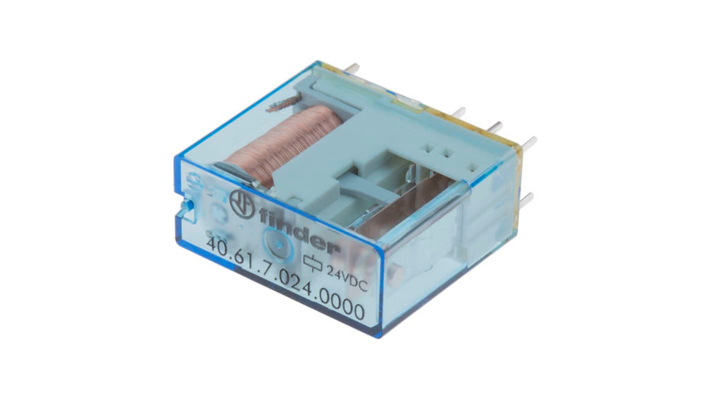 Relè di potenza Finder serie 40, SPDT, montaggio su circuito stampato, tensione bobina 24VDC, corrente di commutazione 16A, potenza bobina 500mW, resistenza bobina 1200Ω, isolamento bobina-contatto 6kV, temperatura operativa -40°C a +85°C, tipo terminale a foro passante, dimensioni 29mm x 12.4mm x 25mm, materiale contatto lega di argento, certificazioni CSA, GOST, IMQ, RINA, SEV, UL, VDE.