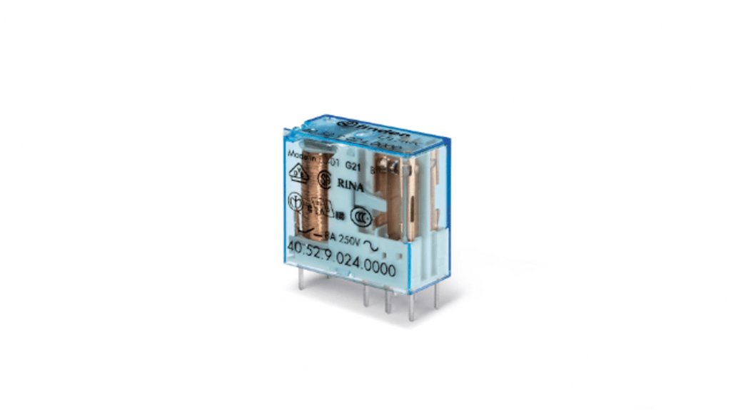 Relè di potenza per circuito stampato, tensione bobina 24V cc, corrente di commutazione 8A, 2 poli, montaggio su guida da 35 mm con terminali a vite, senza vite o a innesto, materiale di contatto senza cadmio, conforme a EN 60335-1, età di scorrimento e spaziatura di 8 mm. Codice costruttore 405270245000, marchio Finder.