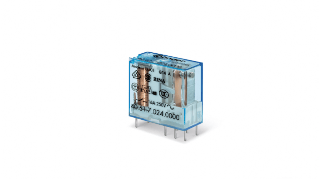Relè di potenza Finder, SPST, bobina 24V cc, montaggio su circuito stampato, A innesto, corrente di commutazione 16A, numero di poli 1, materiale di contatto senza cadmio, soddisfa i requisiti del filo incandescente EN 60335-1, montaggio su guida da 35 mm con terminali a vite, senza vite o a innesto, età di scorrimento e spaziatura 8 mm.