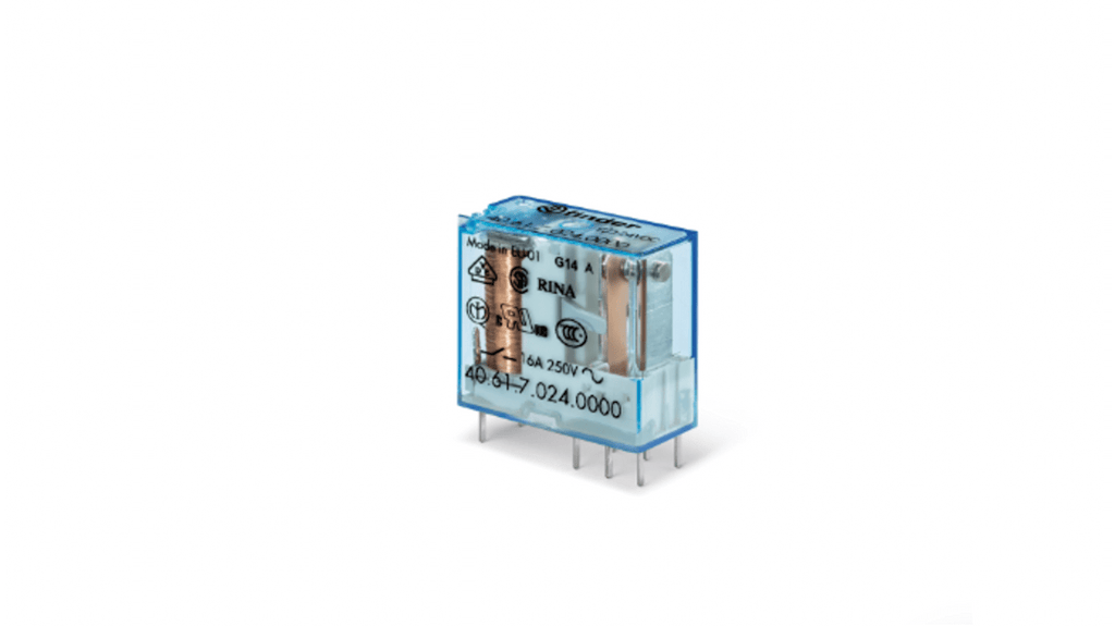 Relè miniaturizzato per circuito stampato, bobina 24V cc, configurazione contatto SPDT, montaggio su circuito stampato A innesto, corrente di commutazione 16A, numero di poli 1, materiale di contatto senza cadmio, soddisfa i requisiti del filo incandescente EN 60335-1, montaggio su guida da 35 mm con terminali a vite, senza vite o a innesto. Codice costruttore 406190240000, marchio Finder.