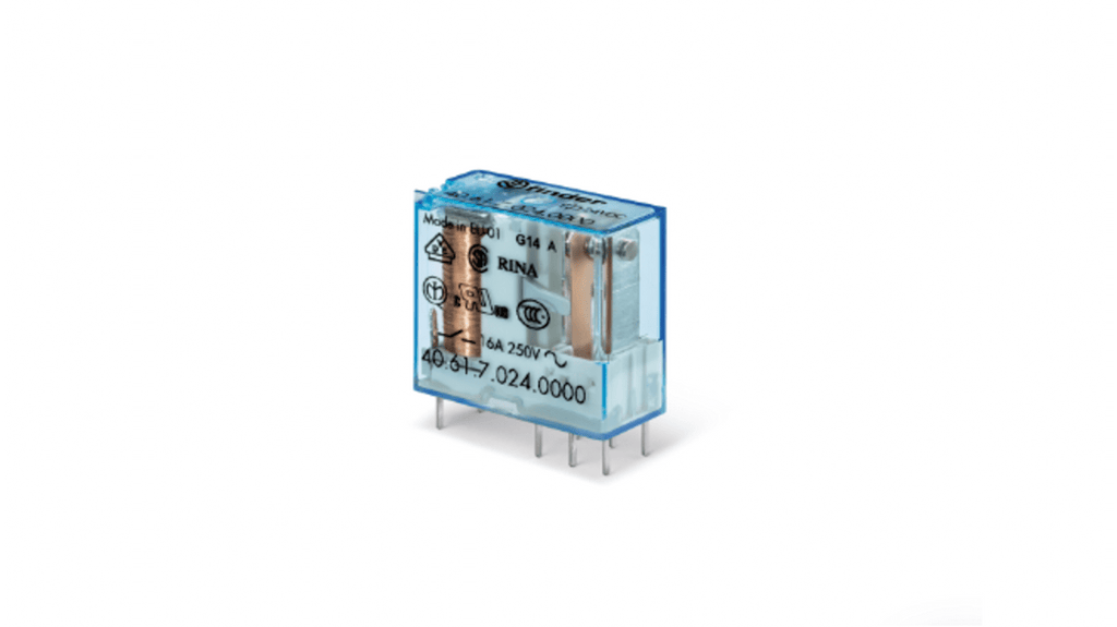 Relè di potenza Finder, SPDT, bobina 24V cc, montaggio su circuito stampato, A innesto. Corrente di commutazione 16A, numero di poli 1, materiale di contatto senza cadmio. Montaggio su guida da 35 mm con terminali a vite, senza vite o a innesto. Soddisfa i requisiti del filo incandescente EN 60335-1. Bistabile: No.