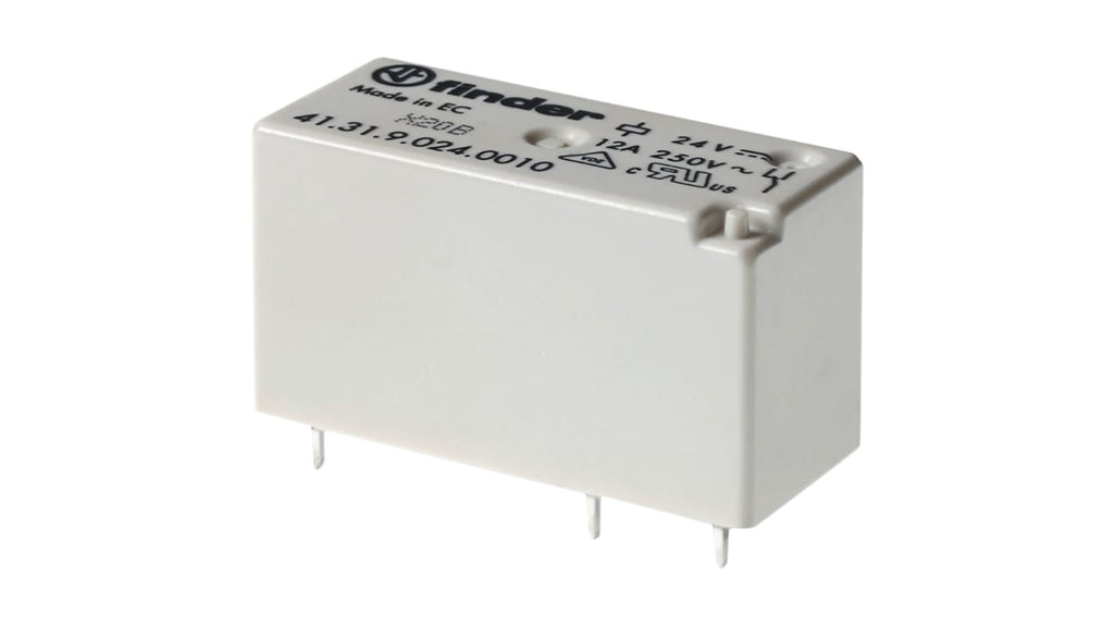 Relè di potenza Finder serie 41, SPDT, bobina 230V ca, montaggio su circuito stampato, corrente di commutazione 12A, distanza di isolamento 8 mm, dimensioni 15,7 x 12,6 x 29 mm, materiale contatto lega di argento, temperatura operativa da -40 a +70 gradi Celsius, standard cULus, EAC, PCT, RINA, UL, VDE, protetto dal flussante RT II.