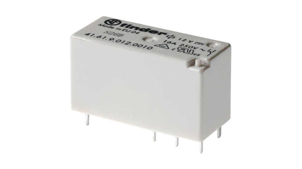 Relè di potenza per montaggio su circuito stampato, bobina 230V ca, configurazione contatto SPDT, corrente di commutazione 16A, distanza di isolamento 8 mm, dimensioni 15,7 x 12,6 x 29 mm, materiale contatto lega di argento, temperatura operativa da -40°C a +70°C, standard cULus, VDE, protetto dal flussante RT II. Codice costruttore 41.61.8.230.0000, marchio Finder.