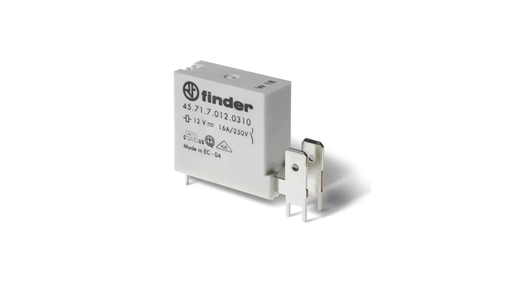 Relè di potenza Finder, SPDT, bobina 12V cc, Terminale Fast-On, isolamento rinforzato 8 mm, distanza di dispersione 6 kV, temperatura ambiente max 125°C, corrente di commutazione 16A, opzione Cadmium Free, conforme alla norma EN 60335-1 (VDE 0700). Codice costruttore 457170121310.
