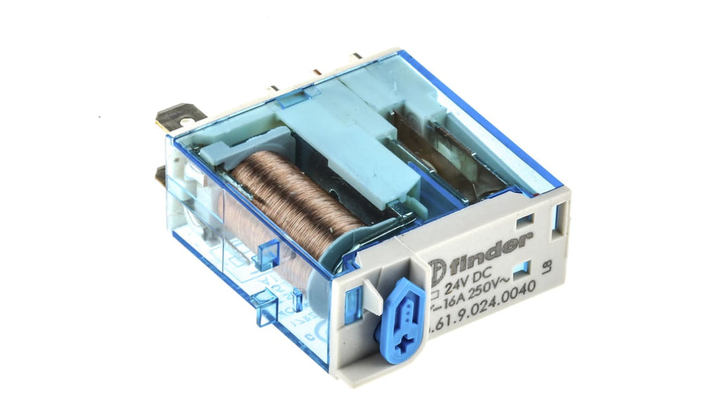Relè di potenza Finder serie 46, SPDT, bobina 24V cc, A innesto, corrente di commutazione 16A, tensione di commutazione massima 250V ca, potenza di commutazione massima 4 kVA, isolamento bobina-contatto 6000 V, materiale contatto AgNi, temperatura operativa -40 a +70 gradi, dimensioni 32,8 x 29 x 12,4 mm, resistenza bobina 1200Ω, potenza bobina 500mW. Zoccoli e adattatori disponibili separatamente. Conformità UL.