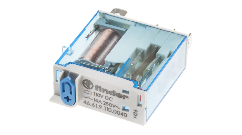 Relè di potenza Finder serie 46, SPDT, bobina 110V cc, A innesto, corrente di commutazione 25A, potenza di commutazione massima 4 kVA, isolamento bobina-contatto 6000 V c.a., materiale contatto AgNi, temperatura operativa -40 a +70 gradi Celsius, dimensioni 32,8 x 29 x 12,4 mm, attacco rapido, conformità UL. Zoccoli e adattatori per montaggio disponibili separatamente.