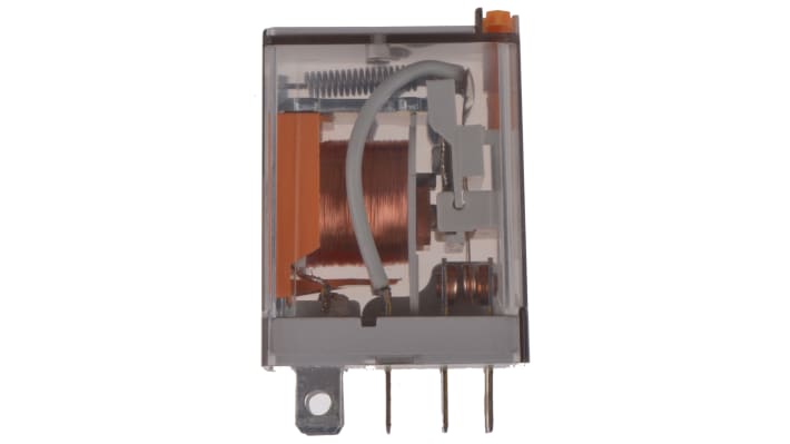 Relè di potenza miniaturizzato DPDT, bobina 24V ca, corrente di commutazione 12A, potenza di commutazione massima 3 kVA, tensione di commutazione massima 400V ca, attacco rapido, temperatura operativa da -40°C a +70°C, dimensioni 37,7 mm x 27,7 mm x 20,7 mm, materiale contatto lega di argento, serie 56.32, conforme a CE, CSA, VDE, IMQ.