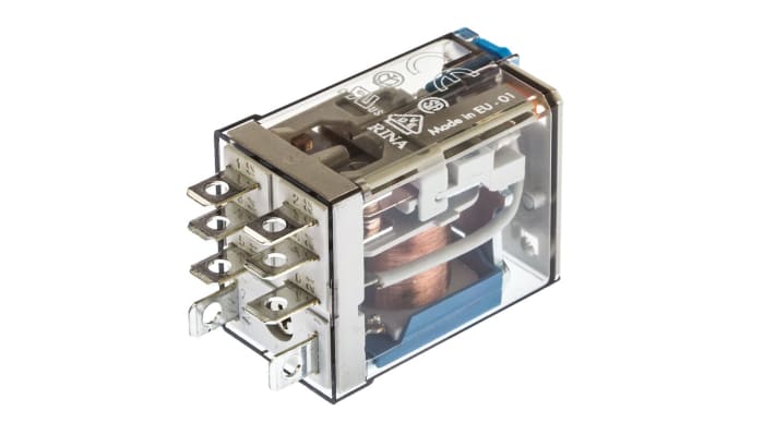 Relè di potenza miniaturizzato DPDT, bobina 24V cc, corrente di commutazione 12A, potenza bobina 1.5W, resistenza bobina 600 ohm, temperatura operativa -40 °C a +70 °C, contatti in lega di argento-nichel, tipo terminale ad attacco rapido, dimensioni 27.7 mm x 20.7 mm x 37.2 mm, certificazioni CE, IMQ, VDE, CSA, utilizza connettori femmina serie 96.